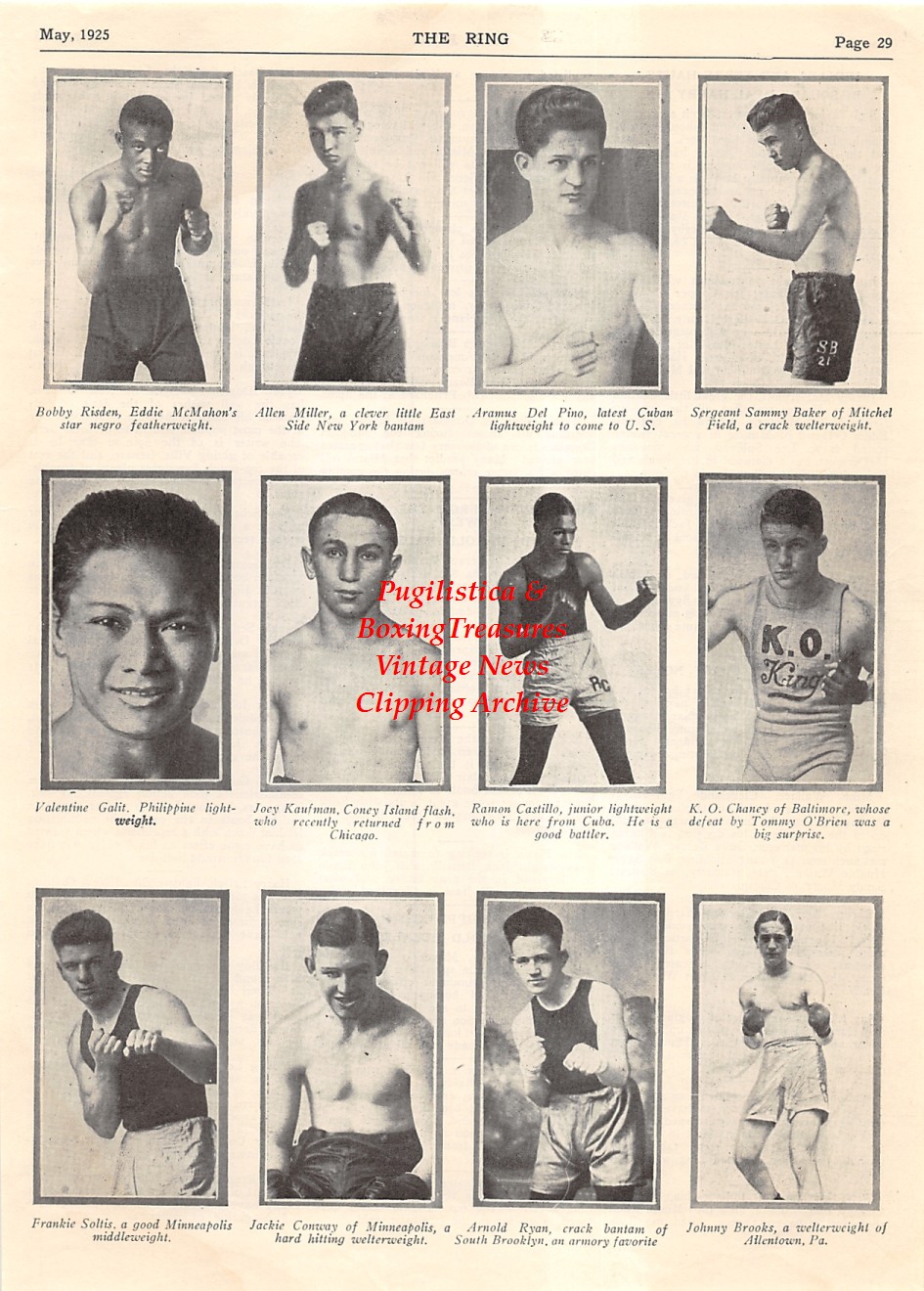 Boxers, Fight Figures and Others pictured - Bobby Risden, Allen Miller (New York Bantamweight), Aramus Del Pino, Sgt. Sammy Baker, Valentine Galit (Filipino Lightweight), Joey Kaufman, Ramon Castillo, George K.O. Chaney, Frankie Soltis, Jackie Conway, Arnold Ryan (Brooklyn Bantamweight), Johnny Brooks (Allentown, PA Welterweight)