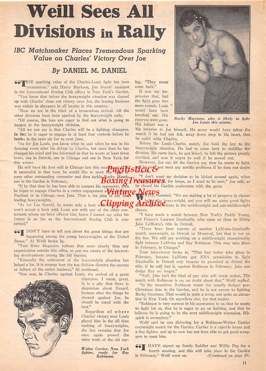 Boxing News Clipping #2569 - Rocky Marciano, Al Weill, Walter Cartier, Bob Fitzsimmons, Jess Willard