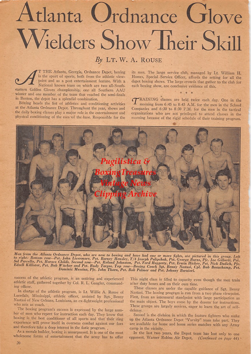 WWII Military Boxing: Atlanta Ordnance Depot boxing team with: John Livermore, Barney Hensley, Joseph Palipchak, George Burns, Joe Gilberti, Sal Parcello, Horace Childs, Roland Johnston, Ford Haggerty, Erwin Hickey, Nick Dadich, Edsell Killister, Bob Witcher, Rudy Targos, Benny Nastasi, Bob Beauchamp, Dominic Messina, John Thorn, Bob Palmer, Johnny Barnieri