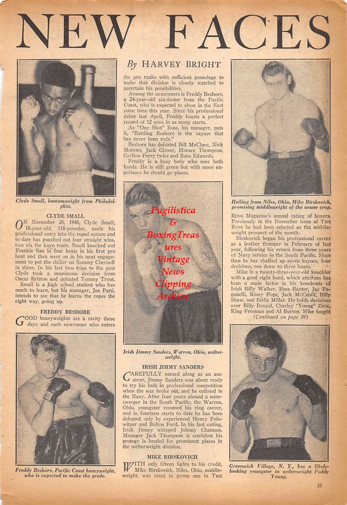 Boxing News Clipping #608 - Clyde Small, Jimmy Sanders, Mike Birskovich, Freddy Beshore, Paddy Young, Manny Ortega, Jim Richie, Bobby Britton, Sam Baroudi, Booker Beckwith, Tony Vero