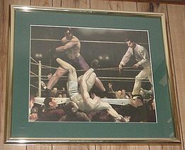 Great framed lithograph print of Luis Angel Firpo knocking Jack Dempsey through the ropes in their celebrated battle of 1923. Firpo thought he had scored a huge upset but Dempsey crawled back in though the ropes and proceeded to beat Firpo senseless over the next round. Great art by George Bellows.